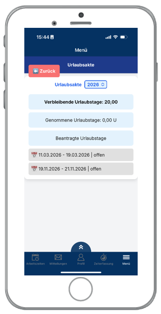 In der Urlaubsakte finden Sie alle Informationen rund um Ihre bisherigen und zukünftigen eingetragenen Urlaube, sowie auch eine Übersicht der beantragten Urlaubstage.