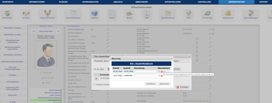 B. Falls der Mitarbeiter abgeglichene Schichten oder bereits eingetragenen Urlaub nach dem Austrittsdatum hat, wird beim Eintragen automatisch ein
